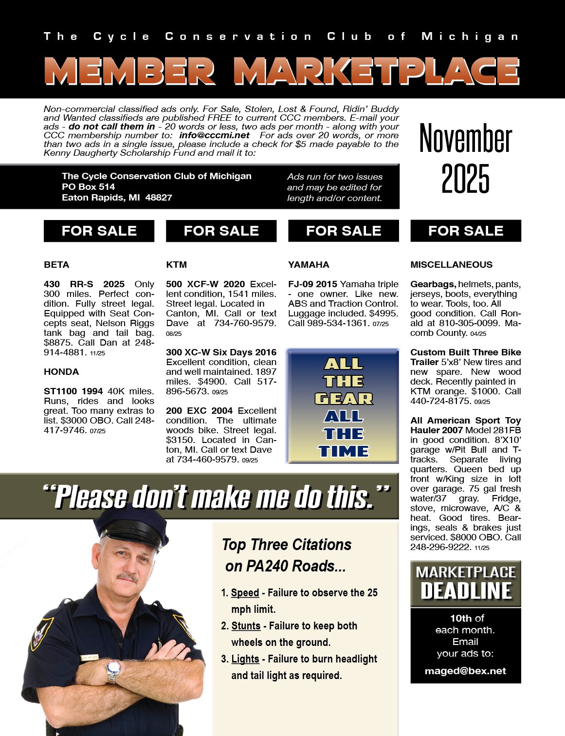 The Cycle Conservation Club of Michigan recommends the following, regardless of requirements of your home State or Province:
