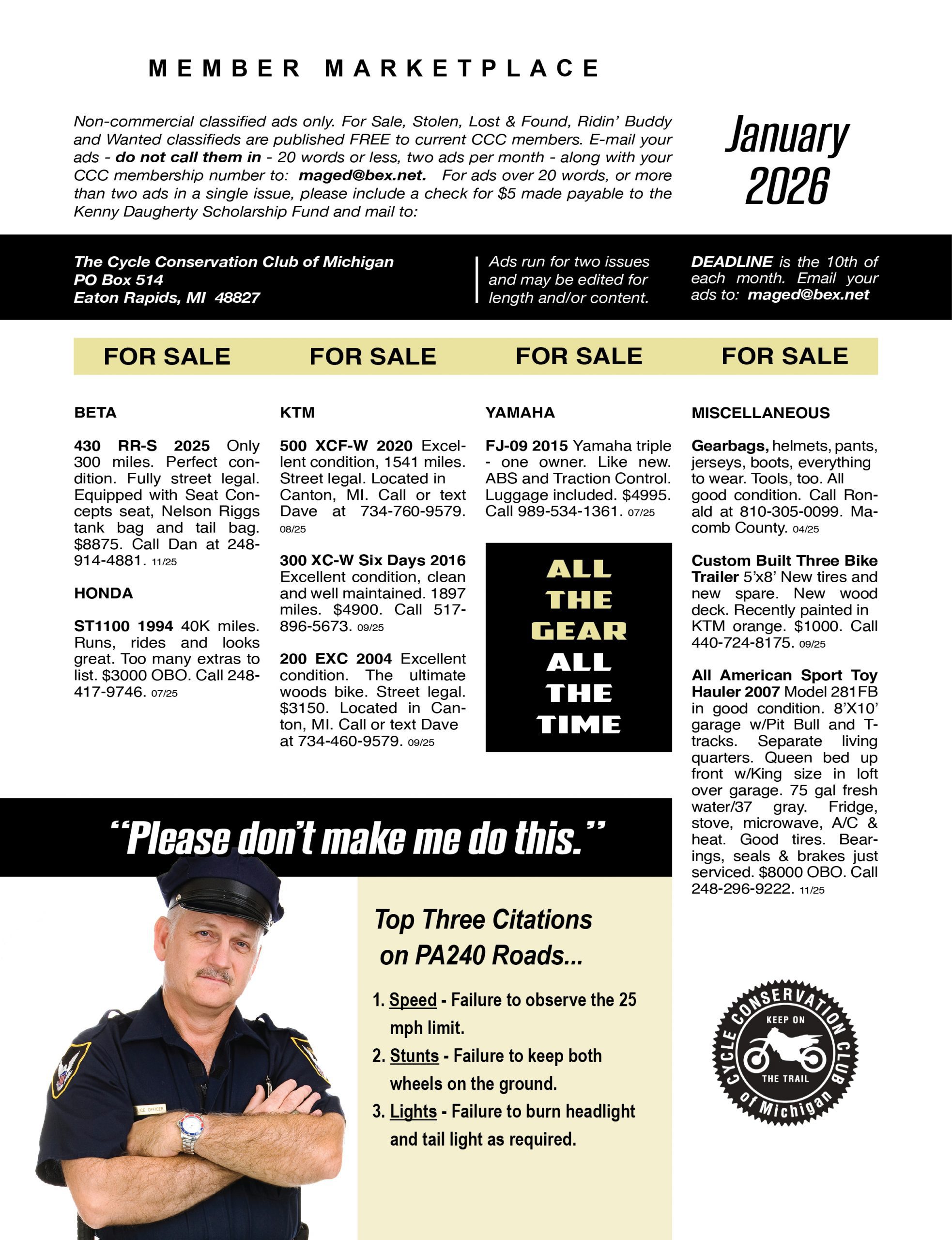 Your membership in The Cycle Conservation Club of Michigan includes a one year subscription to GLTR, the Great Lakes TrailRider Magazine, access to all CCC events and activities plus the members’ section of this website. In addition, your CCC membership is an excellent opportunity to meet new friends and network in a community of like-minded enthusiasts with real passion for the sport we love! To join, simply purchase a membership online, or download, complete and mail the paper PDF form, or contact the CCC office at 517-599-0300.